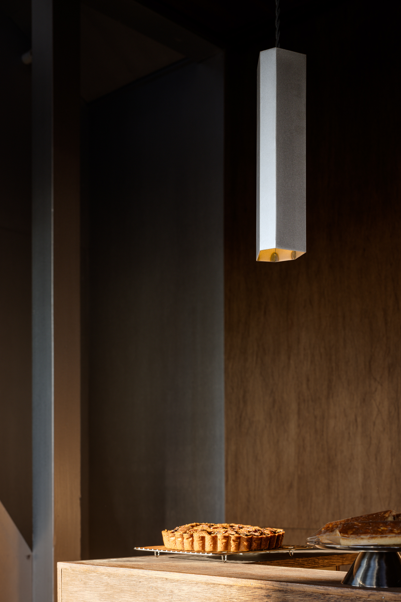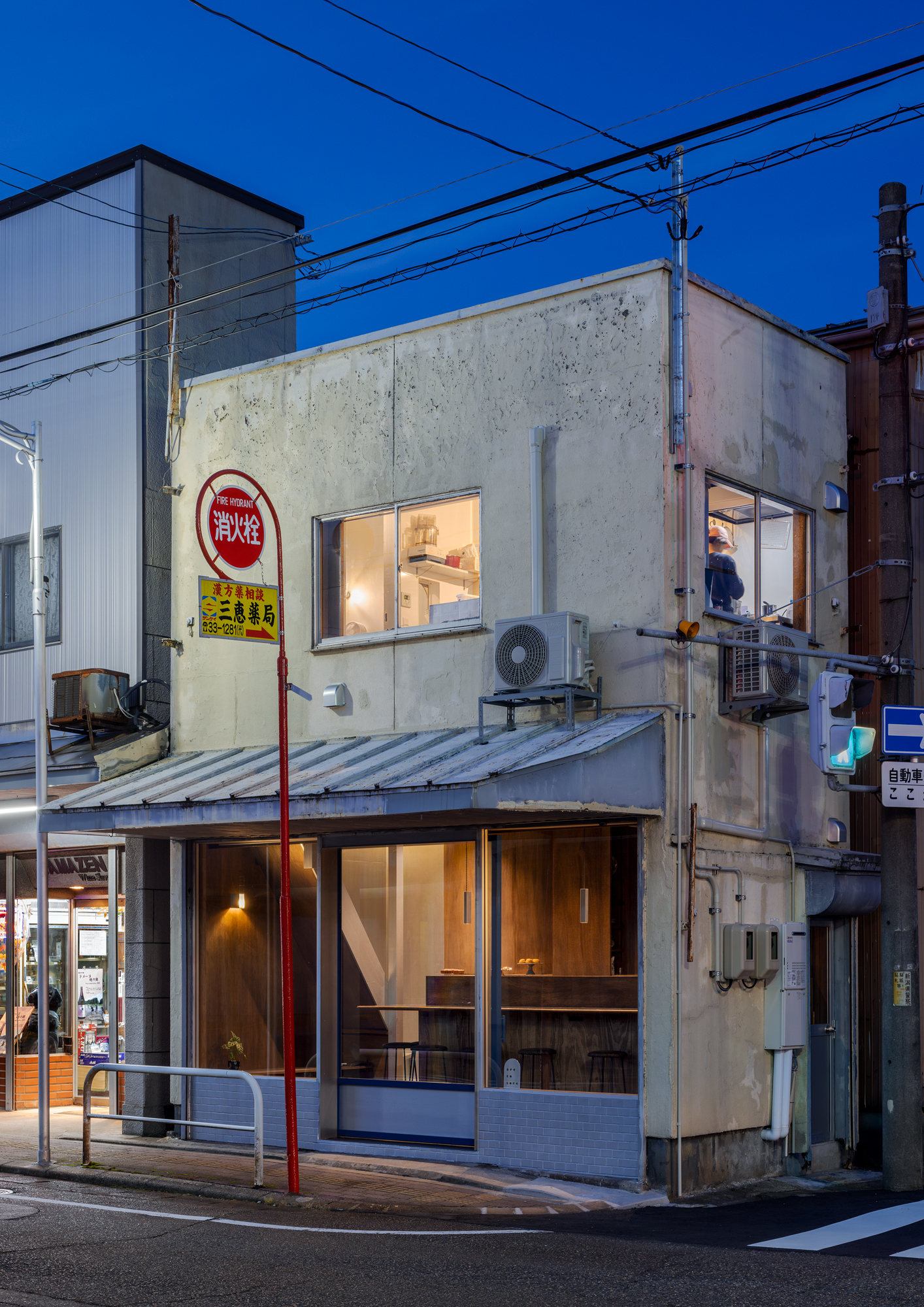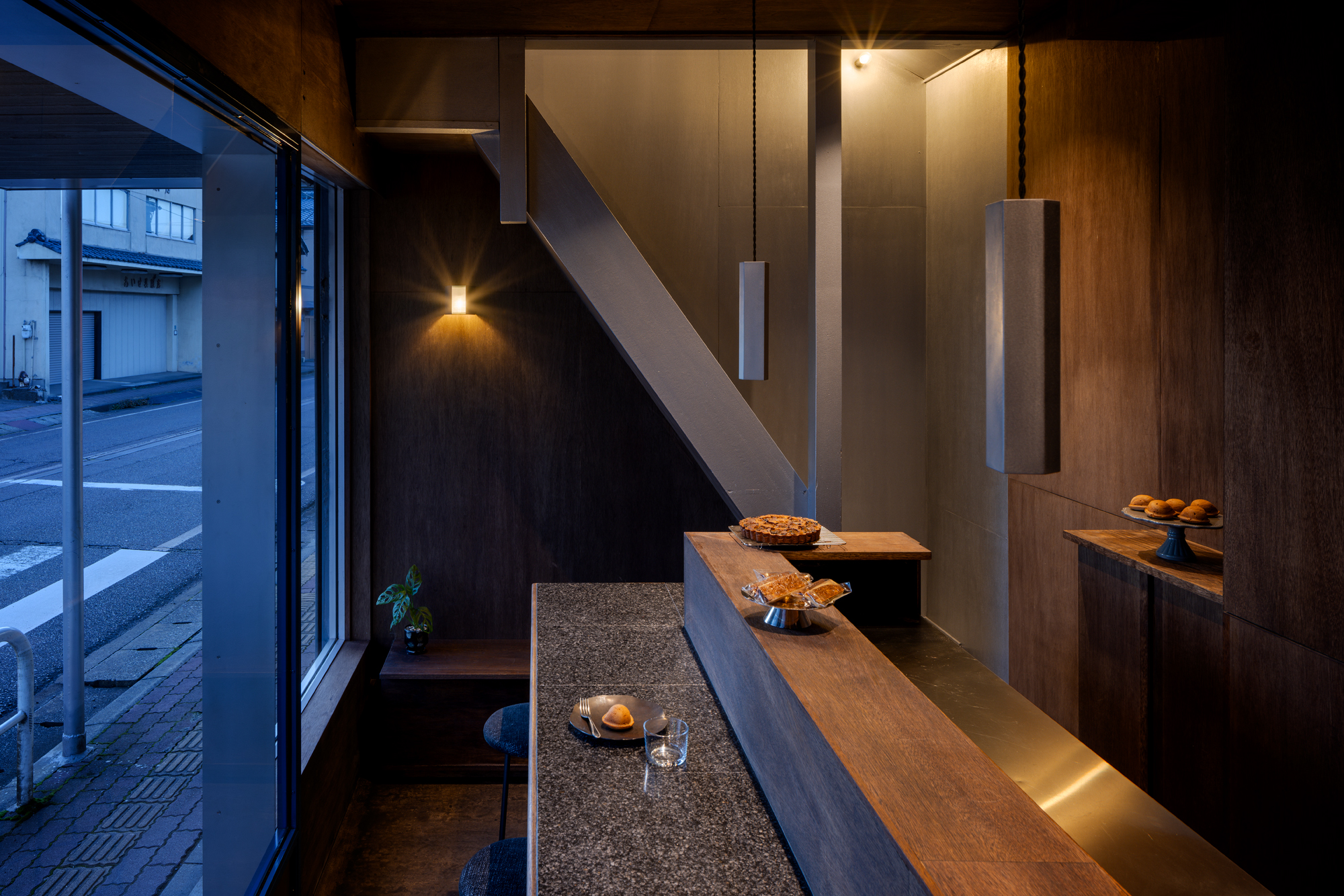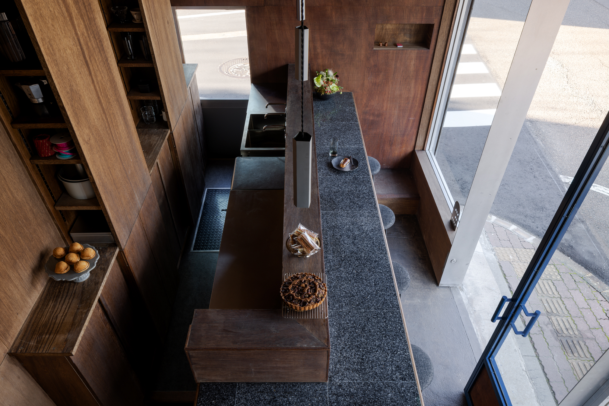 新潟県三条市の商店街の一角に佇む小さな焼き菓子屋である。延床面積わずか6.5坪の小さな建物の1階に焼き菓子が並びカフェ営業もできるカウンター8席、2階に日替わりで約20種類の焼き菓子を製造できる厨房を集約している。小さな店だからこそ店主・お客様・焼き菓子の距離感を重要なテーマとし、動線や什器寸法、視線の抜け方までミリ単位で検討を重ねた。「あれ」や「それ」を混ぜ込んだ焼き菓子の個性を引き立てるため、内装の仕上げ材はあえて種類を限定し、統一感のある落ち着いた背景となるよう設えた。主張を抑えた素材構成によって、焼き菓子そのものが主役となる空間を目指している。シルバーに浮き上がるように塗装した階段室は上階からの光を下階に導き空間に広がりを与えている。階段を上がった先に設けた小さな窓からは厨房の気配を感じ取ることができ、訪れた人の好奇心や子ども心をくすぐる、ささやかな仕掛けとなっている。
