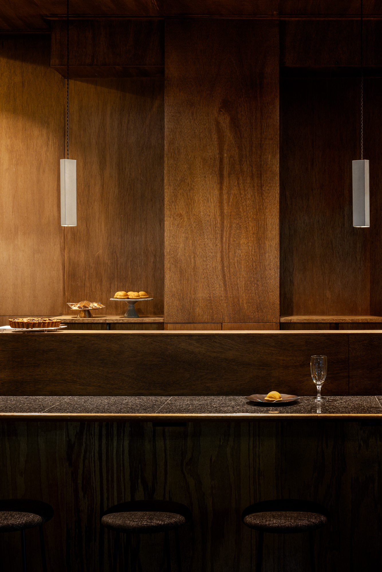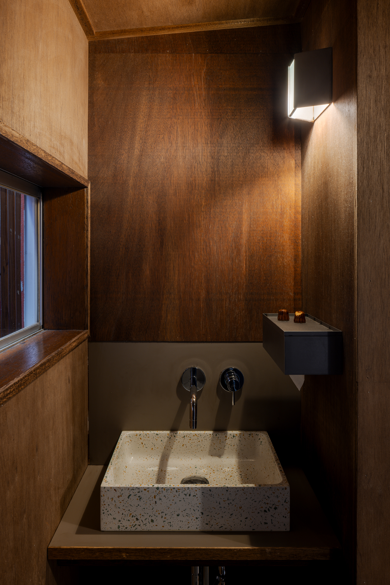 Located along a shopping street in Sanjō, Niigata, this small baked-goods shop occupies a compact two-story building with a total floor area of just 21.8 m². On the ground floor, baked treats are displayed alongside an eight-seat counter where the shop can also operate as a café. Upstairs, a fully equipped kitchen is arranged to produce around 20 varieties of baked goods each day on a rotating menu. Given the shop’s modest scale, the design focuses on the sense of proximity between the owner, customers, and the pastries themselves. Circulation, fixture dimensions, and sightlines were refined down to the millimeter to create an experience that feels both intimate and comfortable. To highlight the character of the shop’s baked goods—infused with “this and that (aretosore),” as suggested by its name—the interior palette was intentionally kept minimal, forming a calm and cohesive backdrop. With a restrained material composition, the space allows the pastries to take center stage. The stairwell, finished in a silver tone that appears to float, draws daylight down to the shop below, creating a sense of openness within its compact interior. At the top of the stairs, a small window offers a glimpse into the kitchen, serving as a subtle device that sparks curiosity for everyone who visits.