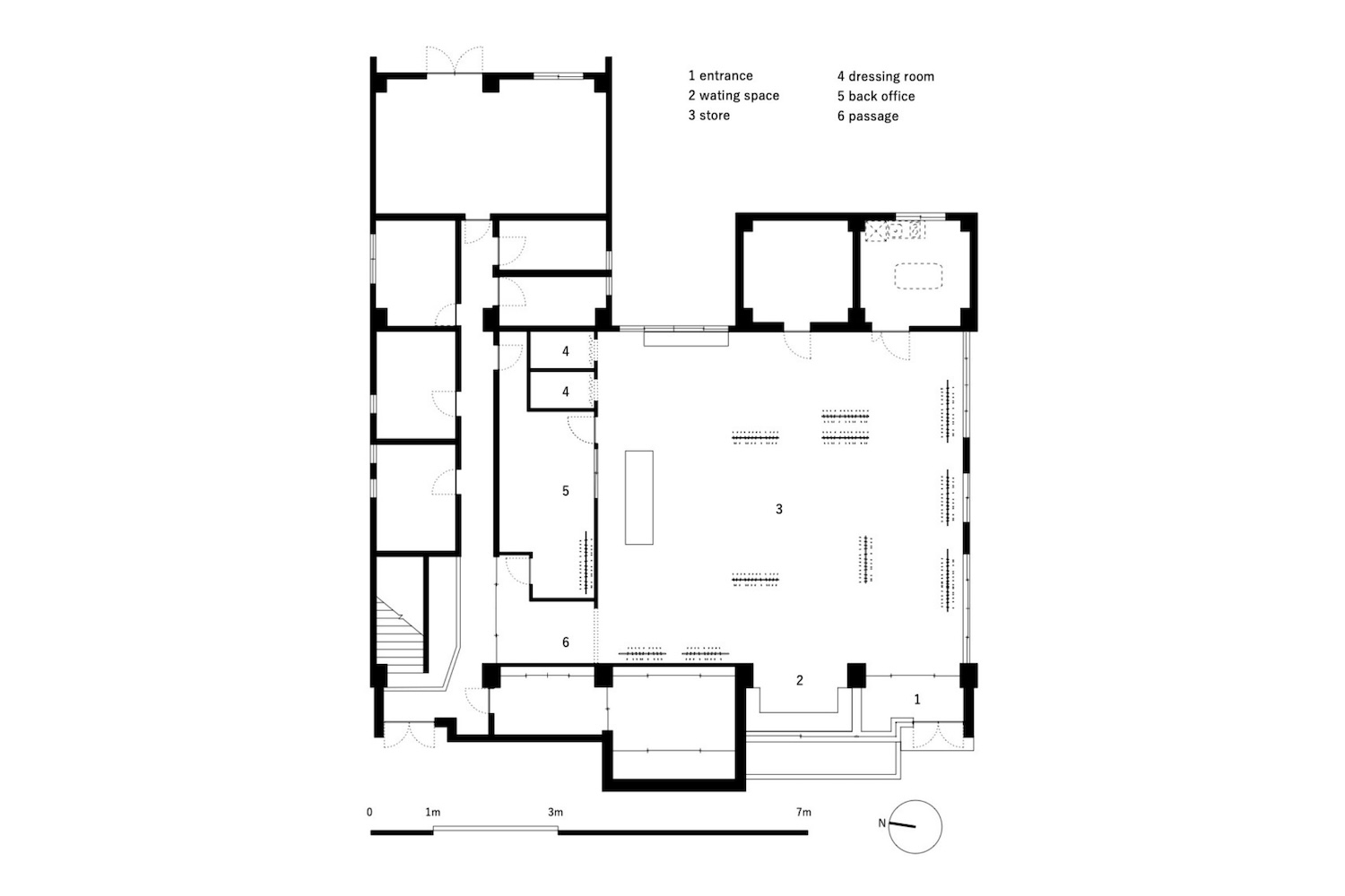 群馬県渋川市にて40年間銀行として使われていた建物を、古着を中心に取り扱うアパレルショップへコンバージョンするプロジェクトである。店主は既存建物のレンガタイルの外壁や金庫の重厚なステンレス製の扉に魅了されこの場所に出店することを決めた。建物の風合いを最大限生かすよう壁はラワンベニヤで覆い、天井はレンガタイルに色味を合わせて塗装した。ラワン壁の塗装は調色したサンプルをいくつも作りながら現地で確認し、既存部分とうまく調和する風合いに仕上げることができた。広い店内で店主が模様替えしやすいよう、組み替え可能な吊り式のハンガーパイプと可動式の置き什器で店内を構成している。古着と建物、それぞれが持つ時間の経過による味わいを大切にするため古いものに丁寧に手入れをすることで、古きものから新しい価値を見出すことができた。