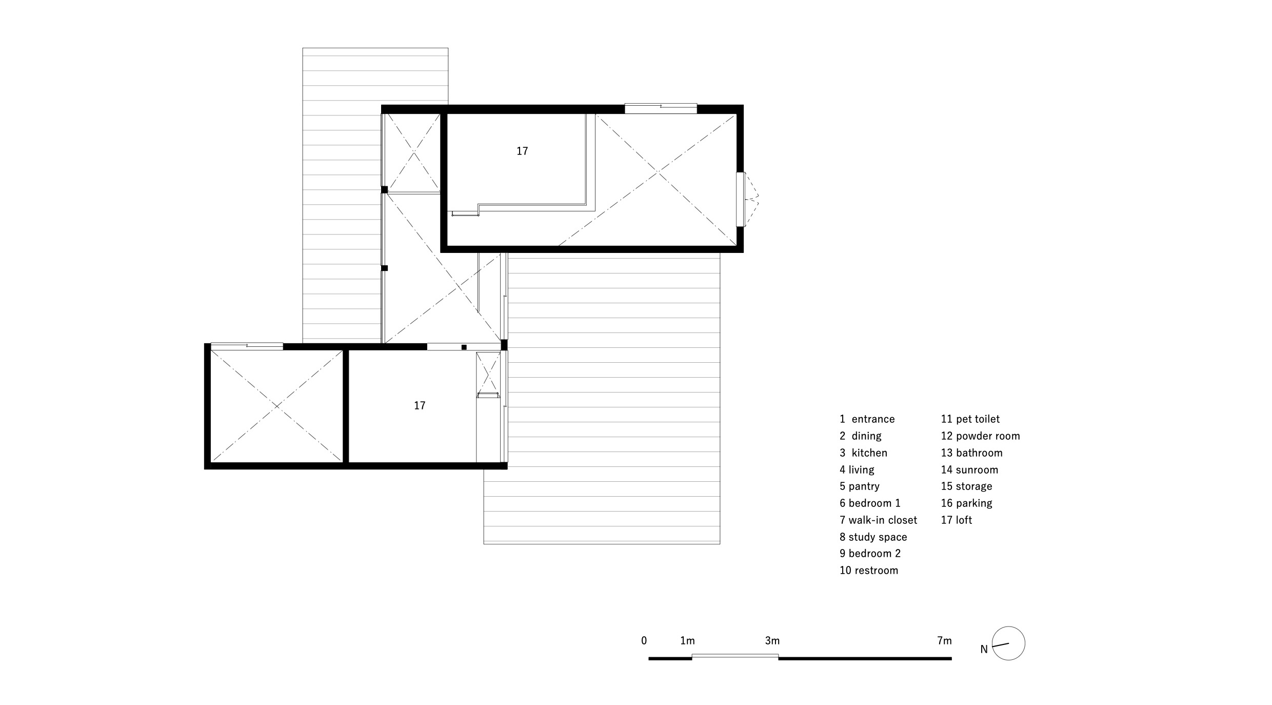 各部屋を分割して風車状に配置し、それらに囲われた場所に家族が集まるダイニングを設けた。ダイニングを囲う壁には外壁と同じ材を使う事で、外部空間が室内に入り込んだ様な抜けのある空間とし、同様に床を土間仕上げとする事で、庭に設けた土間との繋がりを感じられる作りとしている。